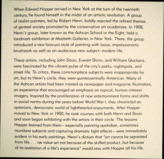 | Modern Life: Edward Hopper And His Time Whitney Museum of American Art October 28, 2010 to April 10, 2011 At the turn of the 20th century, American artists rebelled against the predominating academic art and aristocratic portraiture and began looking to modern life, both city and urban for their subject matter. Edward Hopper (1882-1967) was one of the central figures of this dramatic shift. So were many other artists including Guy Pène du Bois, George Bellows, Charles Burchfield, Thomas Hart Benton, Everett Shinn, Paul Cadmus, Raphael Soyer, and Reginald Marsh. Photographers depicting daily life included Edward Steichen, Paul Strand, and Alfred Steiglitz. This show, organized by Whitney curator Barbara Haskell and senior curatorial assistant Sasha Nicholas, traces the development of realism in American art beginning in 1900, the year that Hopper arrived on New York's art scene. The Whitney has been presenting the work of Edward Hopper throughout the institution's history. But this is the first exhibit to focus specifically on the context in which the artist worked. We owe a debt of gratitude to Gertrude Vanderbilt Whitney, who was the only wealthy art patron at the time to stake her reputation and her fortune on the work of the Ashcan school artists and their successors. It was Ms. Whitney's advocacy and vision that led to the founding of the Whitney Museum of American Art in 1930 and to the formation of the collection on view. |