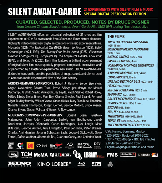include • Ballet mécanique (Léger and Murphy, 1924) is drawn from the definitive Frederick Kiesler print with the color inserts from the hand-colored copy at the Nederlands Filmmuseum, and has been fitted for the first time ever with the George Antheil score in its original instrumentation of 16 player pianos, airplane propellers, etc. • Twenty-four-Dollar Island (Robert Flaherty, c. 1926) is available in the longest known version of the film made from excellent 35mm film elements discovered at Gosfilmofond of Russia and Nederlands Filmmuseum with introductory titles derived directly from Flaherty’s own notes. • Anthology Film Archives, under the direction of the legendary filmmaker and archivst Jonas Mekas, reveals its vast holdings of unique American experimental films with some of the DVD’s rarest discoveries: films by Rudy Burckhardt, Jerome Hill, Lewis Jacobs, Henwar Rodakiewicz, Seymour Stern, Christopher Young, and many more.. • Warner Bros., Turner Entertainment, and Paramount Pictures opened their studio vaults to offer excellent quality 35mm archive copies of works by James Cruze, Busby Berkeley, Oskar Fischinger, Ernst Lubitsch, Paul Burnford, and Slavko Vorkapich. • The British Film Institute, Library of Congress, Museum of Modern Art, and George Eastman House loaned pristine preservation prints of a variety of late 19th century and early 20th century pioneer film titles by Edison Manufacturing and American Mutoscope and Biograph Companies as well as many one of a kind 35mm and 16mm films by avant-garde filmmakers Dudley Murphy, Robert Florey, and Ralph Steiner. • The complete works of abstract film artist Mary Ellen Bute are presented in beautiful 35mm preservation prints along with numerous other ground-breaking abstract animations by Alexandre Alexeieff, Francis Bruguiere, Douglass Crockwell, Dwinell Grant, Francis Lee, Man Ray, Rrose Selavy (aka Marcel Duchamp), Norman Mclaren, and George Morris. • Renowned American collage artist and filmmaker Joseph Cornell is represented by his brilliant film montages salvaged by animator Lawrence Jordan and include The Children’s Party, Cotillion, Midnight Party, Thimble Theater, Carousel, and Jack’s Dream (all films c. 1938- ) and several other titles inspirational to Cornell’s filmmaking. • Vintage home movies of the 1920s and 30s by amateurs Elizabeth Woodman Wright and Archie Stewart are transferred from the original 16mm picture rolls held at Northeast Historic Films, Bucksport, Maine. While other amateur films by Norman Bel Geddes, Lynn Riggs, Emlen Etting, John C. Hecker, and Frank Stauffacher are presented off recently made preservations masters. • At least two-thirds of the program is silent. Unless the filmmakers wished their work to be shown without music, all the silent films have been fitted out with very nice music composed and performed by some of the world’s best silent film composers: Donald Sosin, Eric Beheim, Robert Israel, Rodney Sauer, Neil Kurz, and Shane Ryan. Original music includes compositions by George Atntheil, Marc Blitzstein, Alec Wilder, Jack Ellitt, and Cameron MacPherson. • Introductory historical notes and filmmakers' biographies written by Kevin Brownlow, David Curtis, R. Bruce Elder, Robert A. Haller, Jan-Christopher Horak, David James, Scott MacDonald, Bruce Posner, David Shepard, Paul Spehr, Cecile Starr, and 31 others and rare film and filmmakers photos in a 253-page picture gallery. |